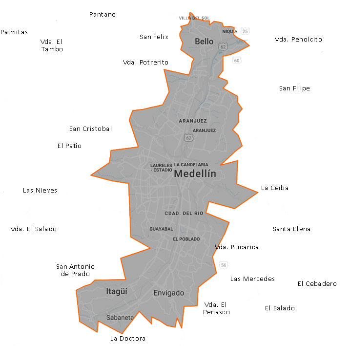 Todas las regiones que figuran en el mapa están dentro del área de servicio de Mudanza Medellín. Nosotros operamos fuera de estas fronteras, así, sin embargo, los costos adicionales se pagan para mayores distancias.